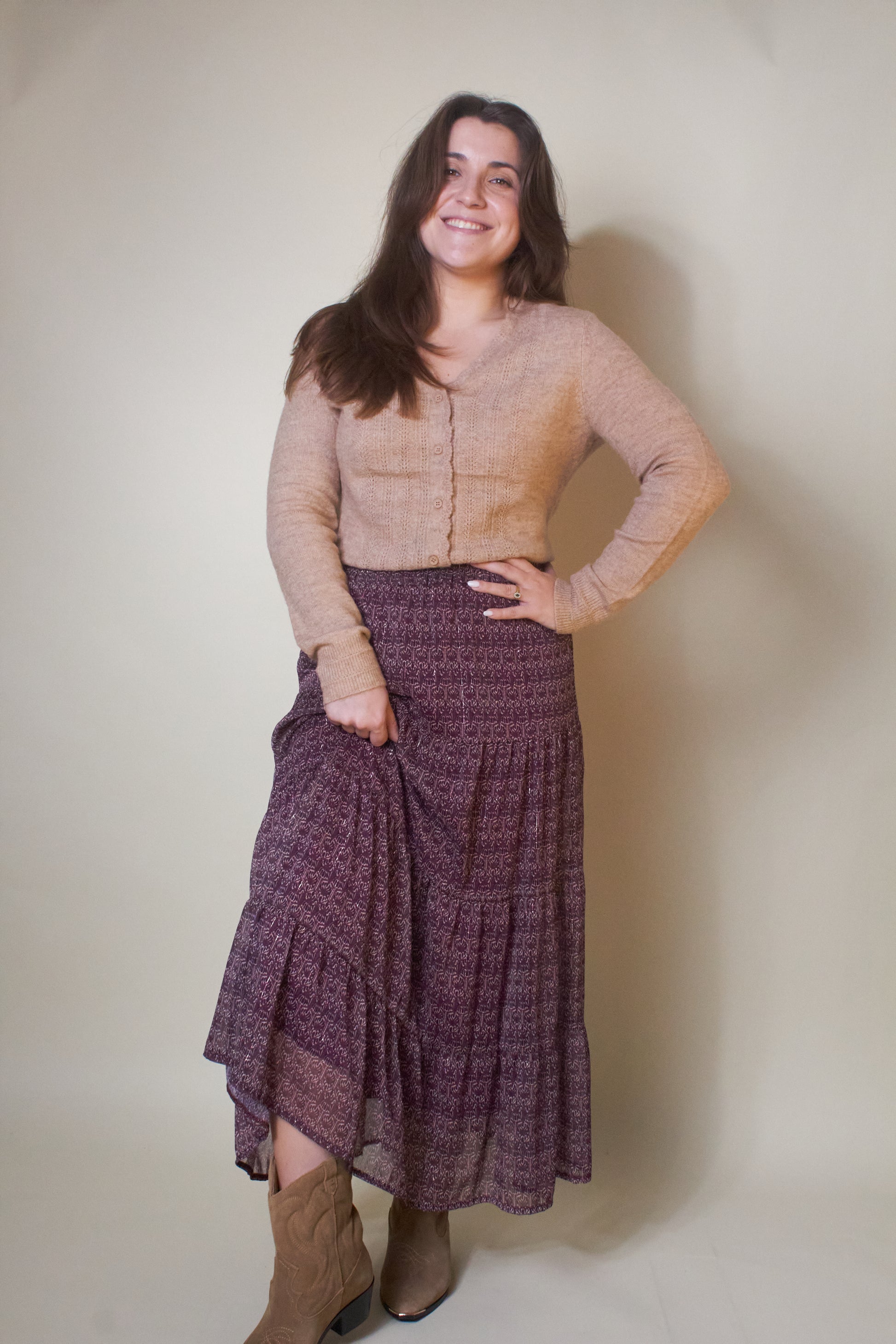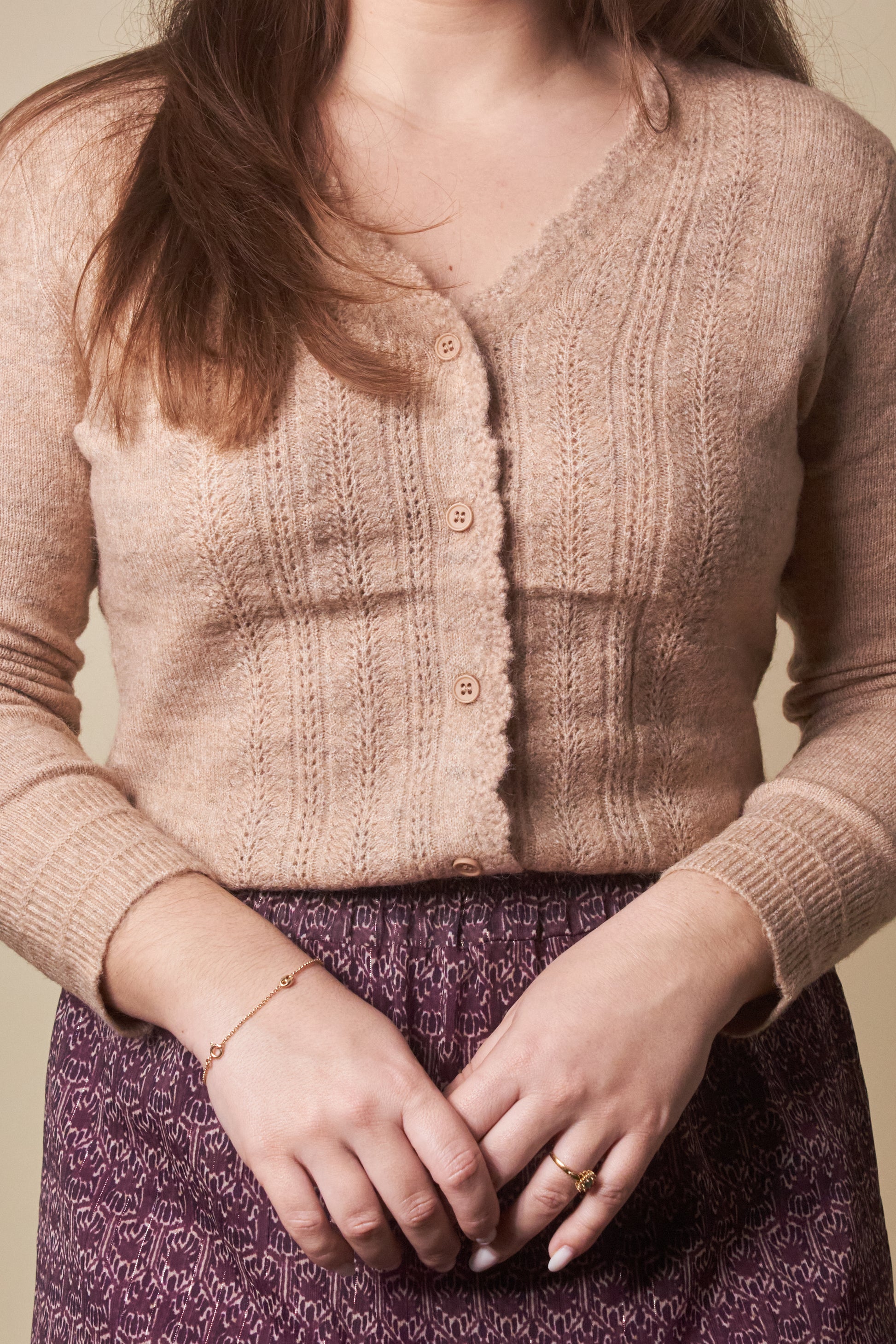 Abrace a primavera dourada com o cardigan bege ROSA BOSSA. Perfeito para a transição da estação, é ideal para garantir a sofisticação e elegância no regresso aos dias de sol.
